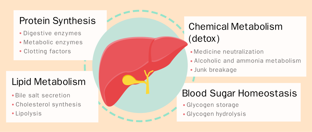 Liver is responsible for protein synthesis, lipid metabolism, chemical metabolism, and blood sugar homeostasis.